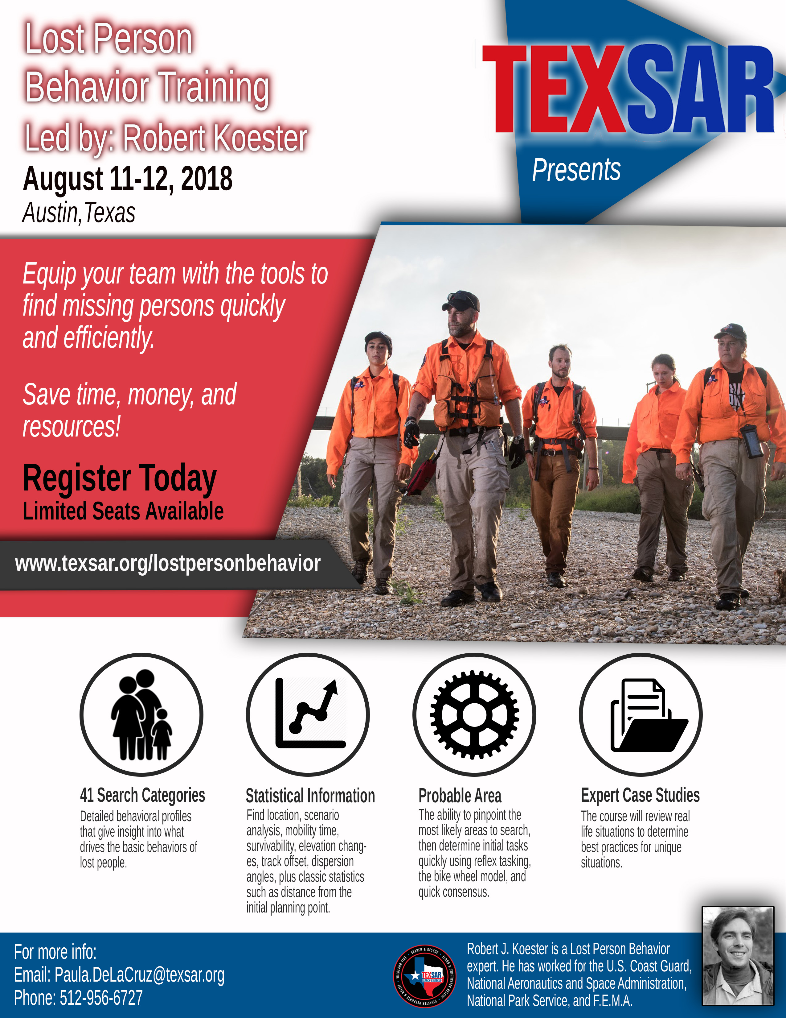 For registration and more information please visit www.texsar.org/lostpersonbehavior or contact TEXSAR at 512-956-6727 or info@texsar.org.
