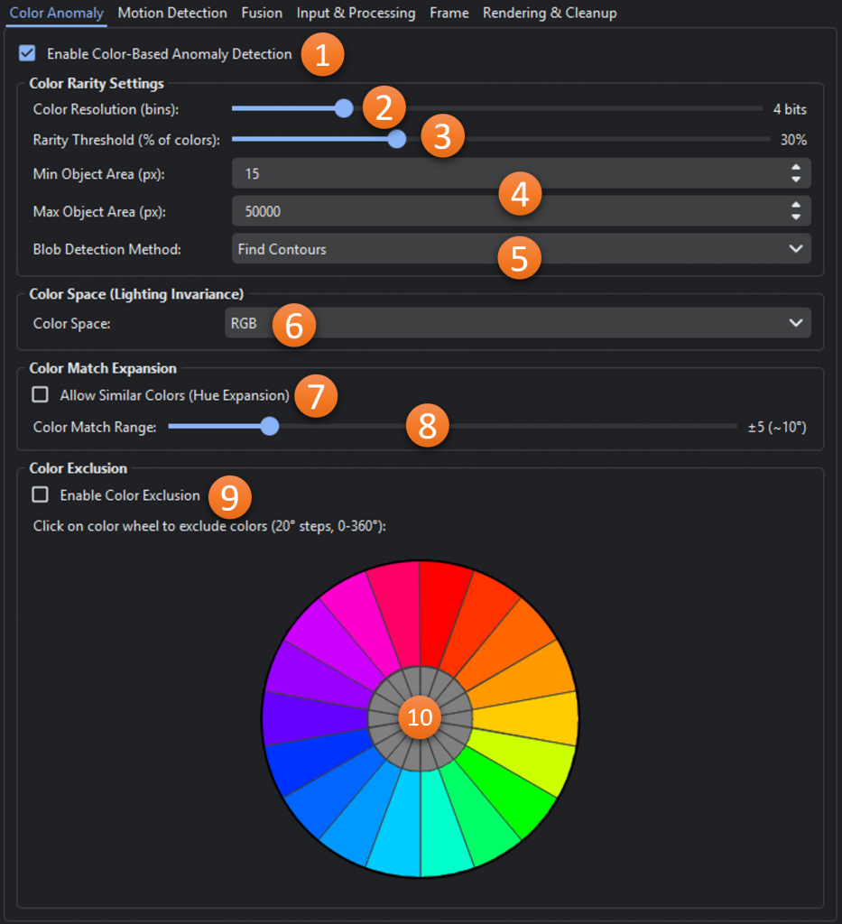 - Enable Color Exclusion: Toggles the exclusion of anomalies based on average hue.
