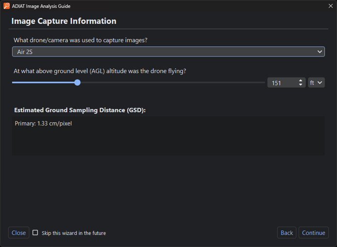 The Image Analysis Setup Guide provides a structured approach to configuring ADIAT for image analysis. In some steps, such as the Image Capture Information screen shown below, default values are populated automatically based on metadata extracted from the image files. In other steps, information is collected through a sequence of configuration prompts to ensure alignment with the intended analysis objectives. When the setup process is complete, the collected configuration values are applied to the analysis settings and ADIAT begins image processing.