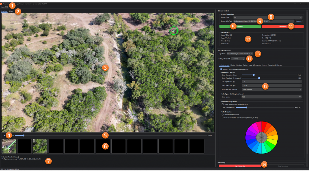 Version 2.0 of ADIAT introduces streaming analysis with support for video from files, RTMP, and HDMI capture. Similar to the image analysis process, the input stream is analyzed using detection algorithms and areas of interest are highlighted for review.